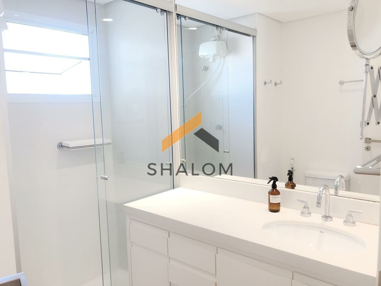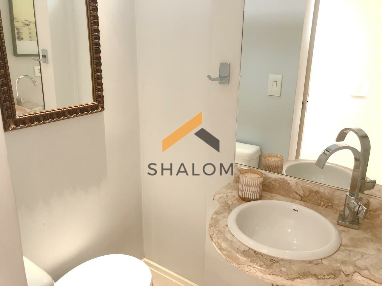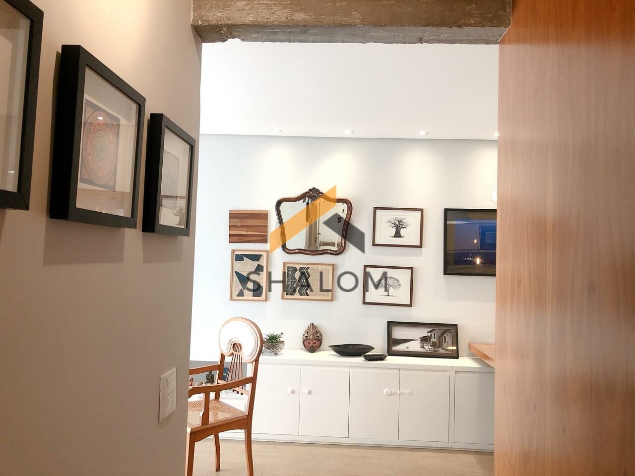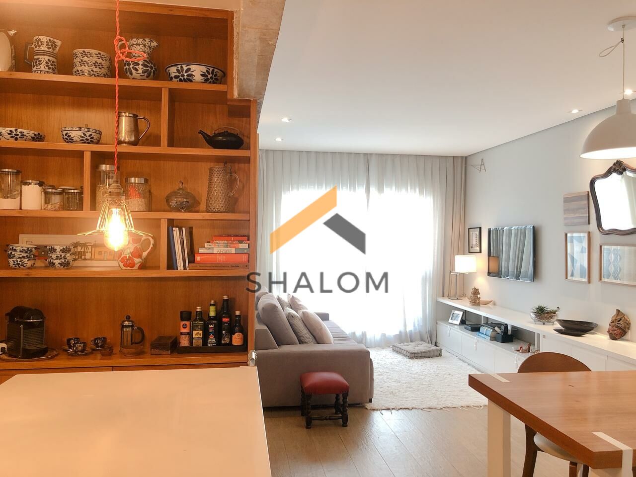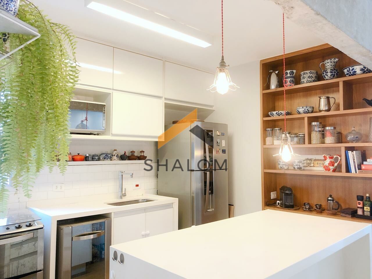Logo na entrada, à esquerda, você encontra um lavabo discreto e charmoso. Ideal para receber amigos com conforto. A cozinha, que se integra perfeitamente à sala, é moderna e prática. A ilha no centro faz o ambiente ser ainda mais convidativo, criando um espaço ideal para reuniões informais. As vigas expostas trazem um toque de rusticidade, enquanto a marcenaria planejada aproveita cada centímetro do apartamento.