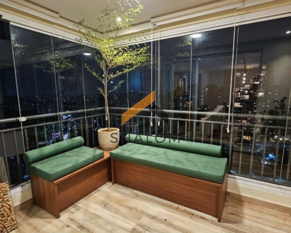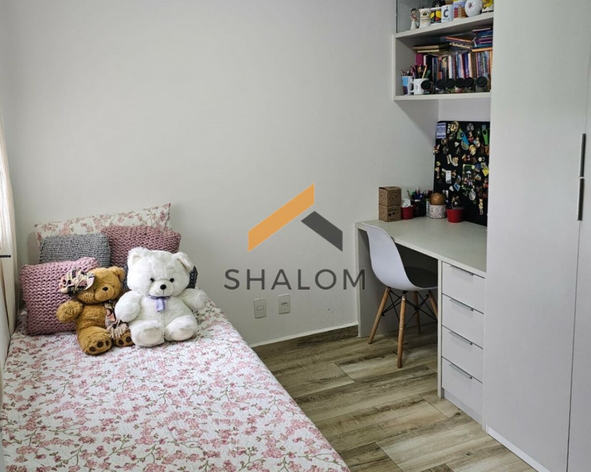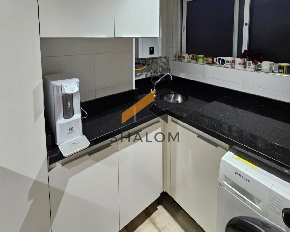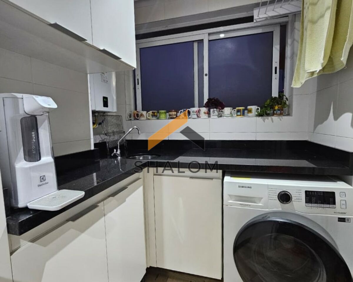 A área íntima conta com 2 dormitórios, sendo 1 suíte. Todos os cômodos possuem armários embutidos, garantindo praticidade e organização. O imóvel dispõe ainda de área de serviço, 2 vagas de garagem e um depósito de 2m².