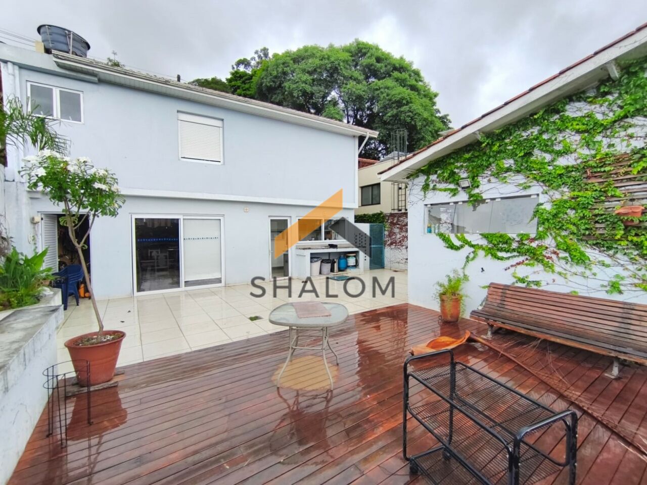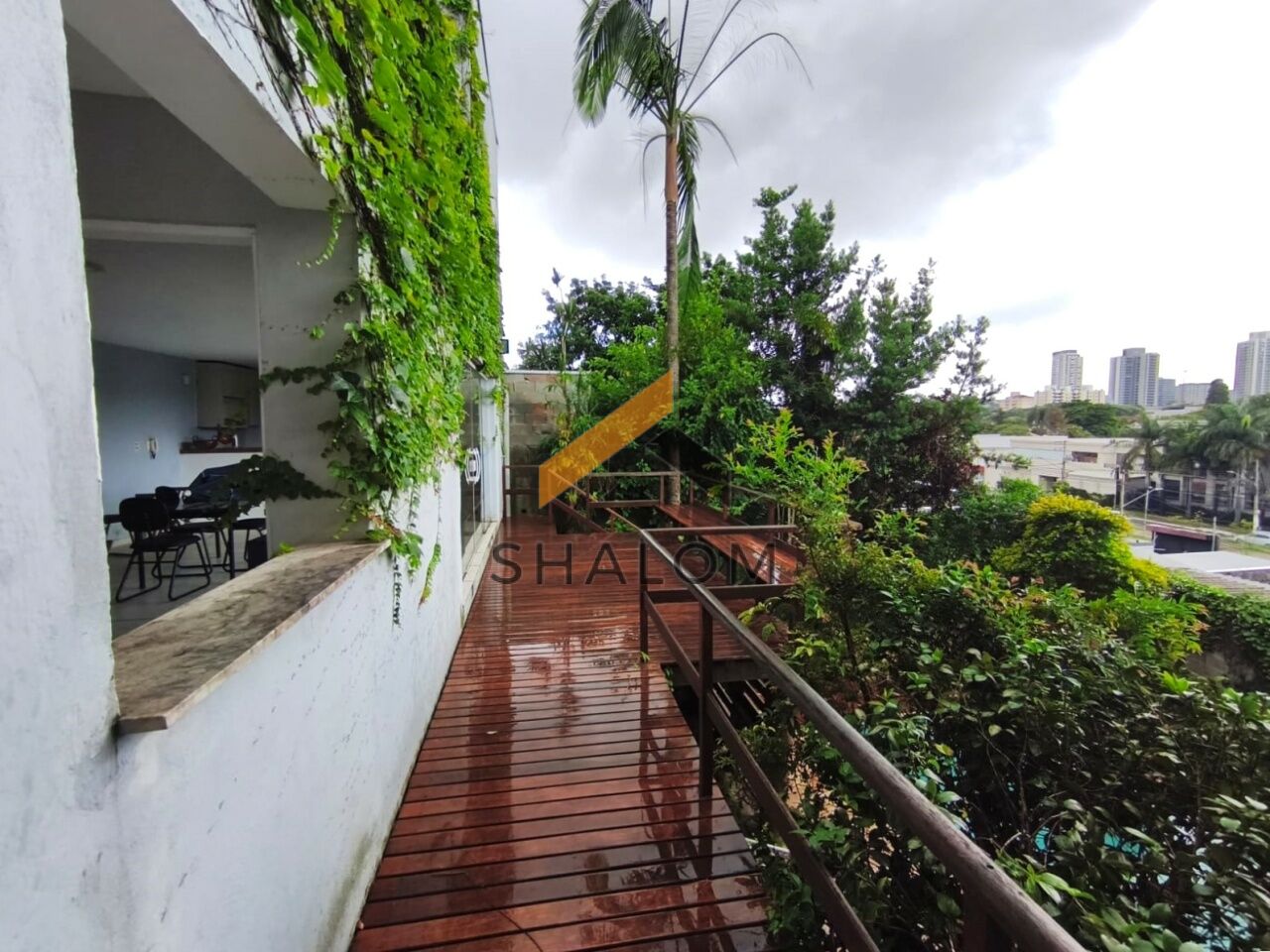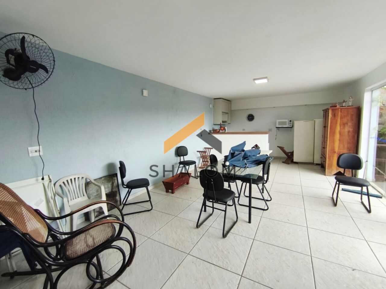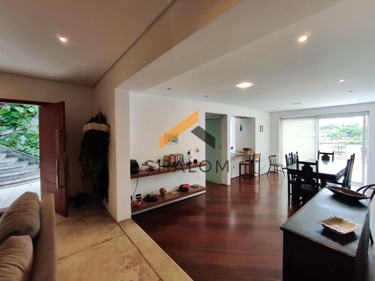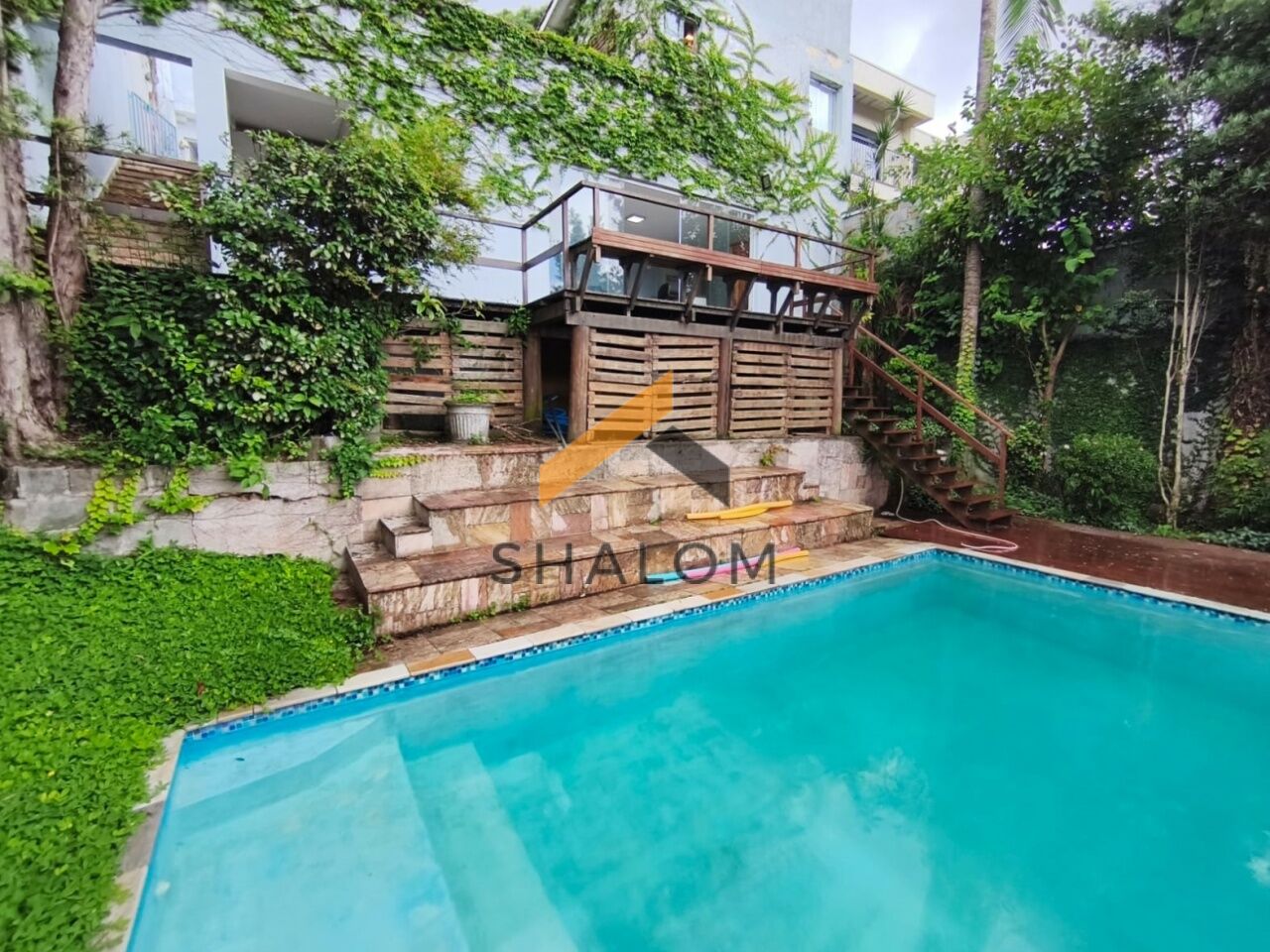 No andar inferior, a casa oferece um salão espaçoso com cozinha, com diversas possibilidades de uso, além de deck de madeira com vista para a piscina da casa.