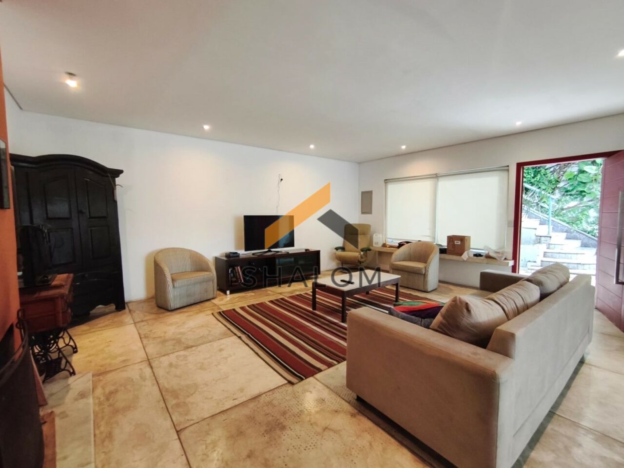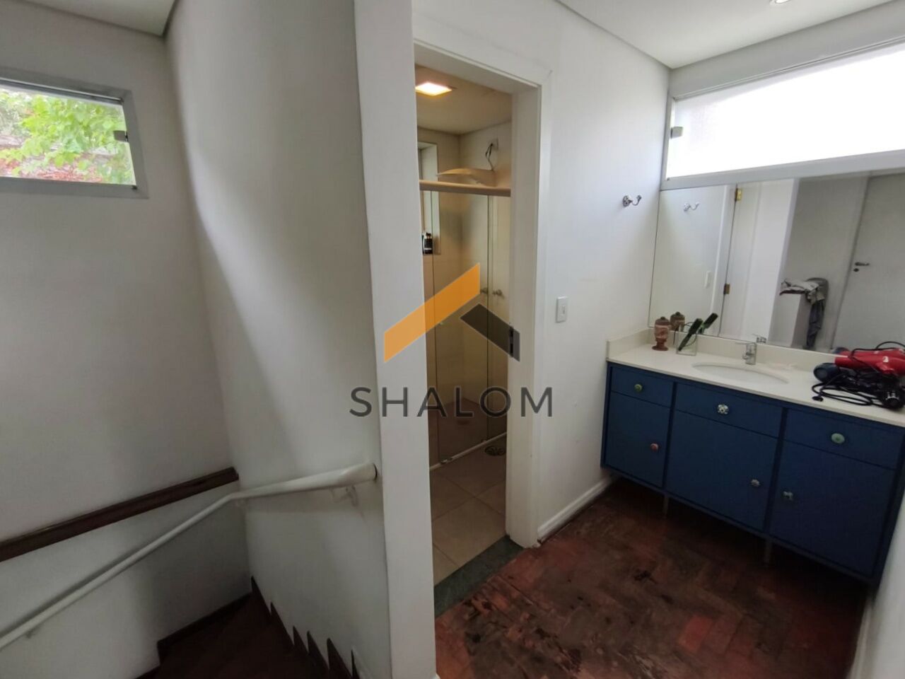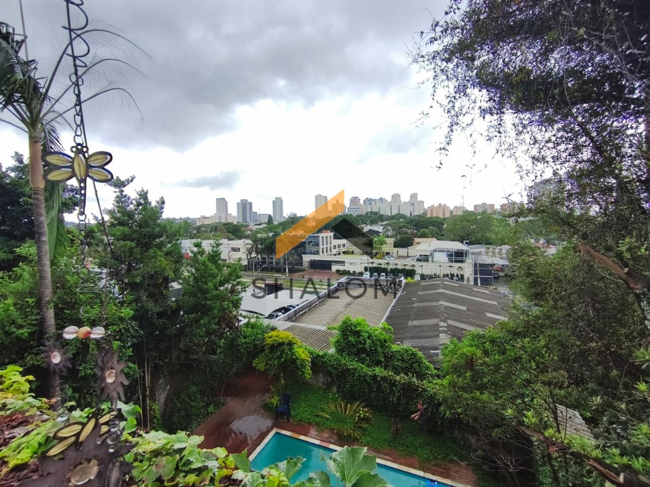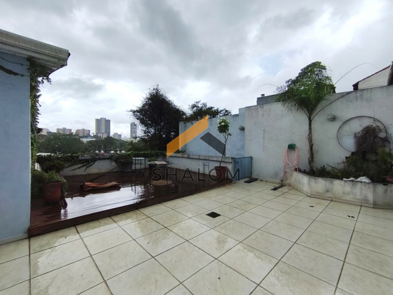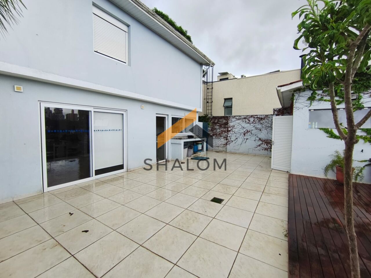 No andar inferior, a casa oferece um salão espaçoso com cozinha, com diversas possibilidades de uso, além de deck de madeira com vista para a piscina da casa.
