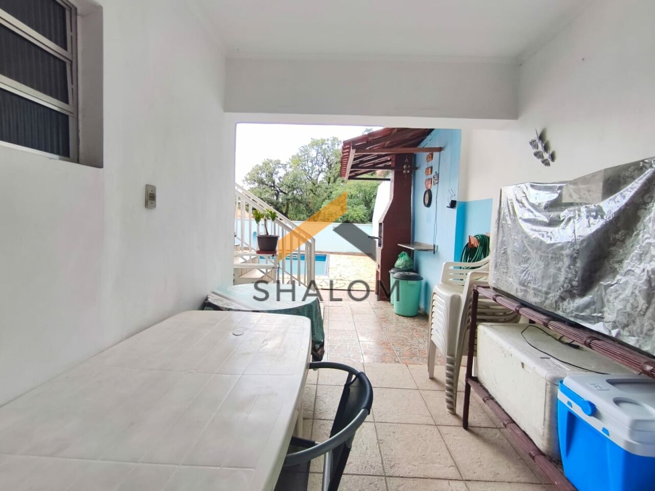 Nos fundos, o quintal é um convite ao lazer: piscina, churrasqueira e área coberta para refeições e convivência formam um ambiente ideal para relaxar e receber amigos. Há ainda uma ducha externa, um cômodo adicional que pode ser usado como quarto ou escritório, banheiro de apoio e uma lavanderia funcional.